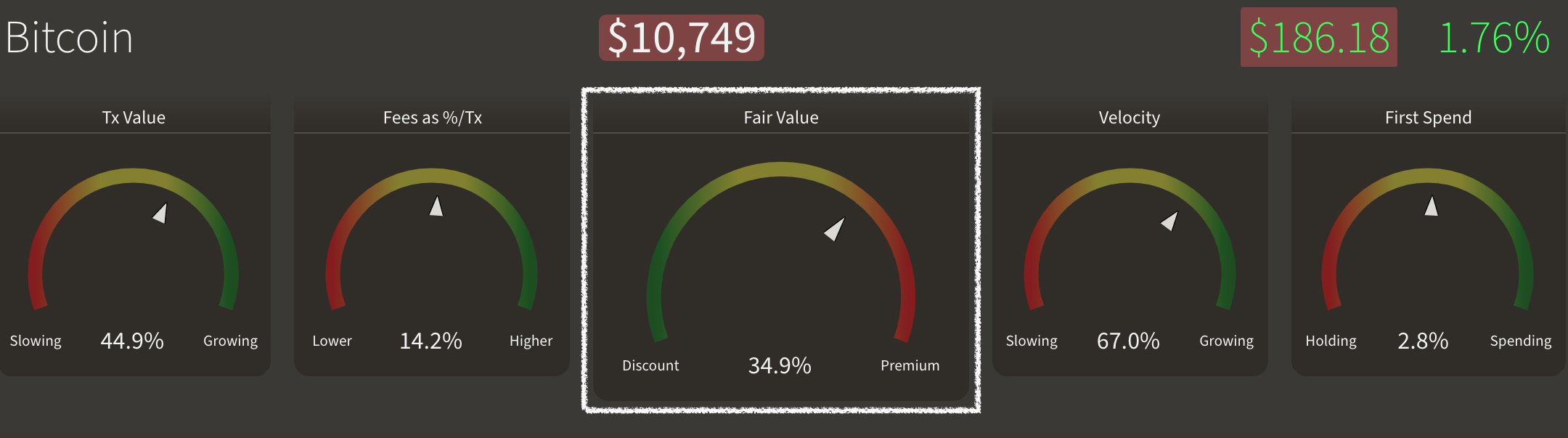 Fair value is a measure of the price attributable to each bitcoin, relative to its utility as a global settlement network. We detailed the fair value in an earlier post, but in short it is calculated as follows:
