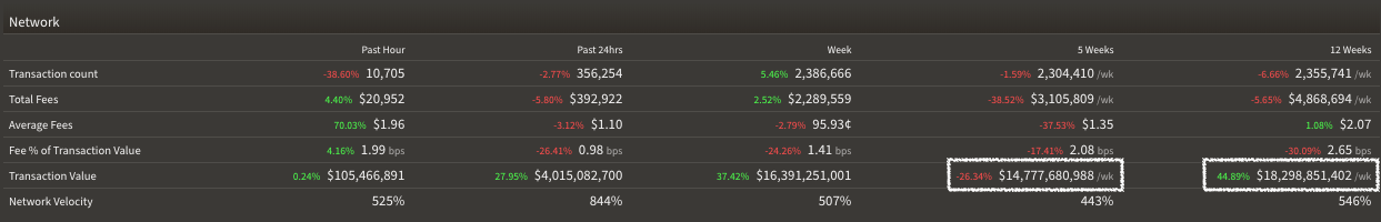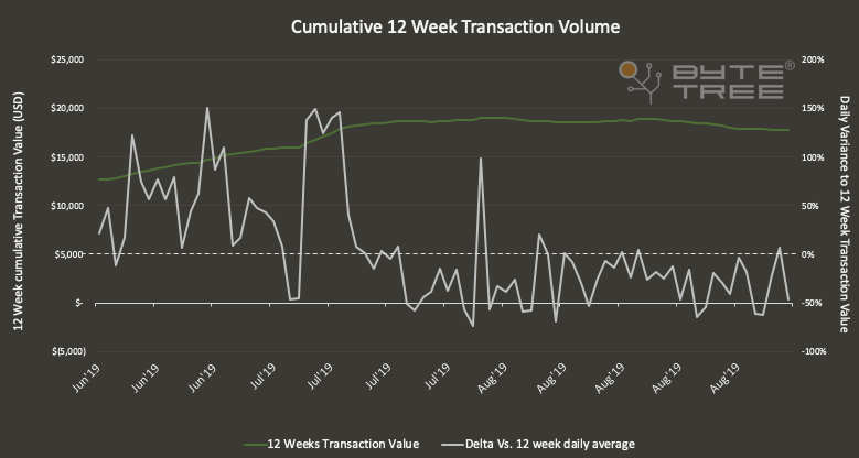 The TX volume (grey line) was much higher earlier in the quarter, expanding the cumulative 12-weeks TX volume (Green line). The daily transaction volume then started to average below the 12-week cumulative volume from mid-July until present day, seen in the right-hand side of the chart:
