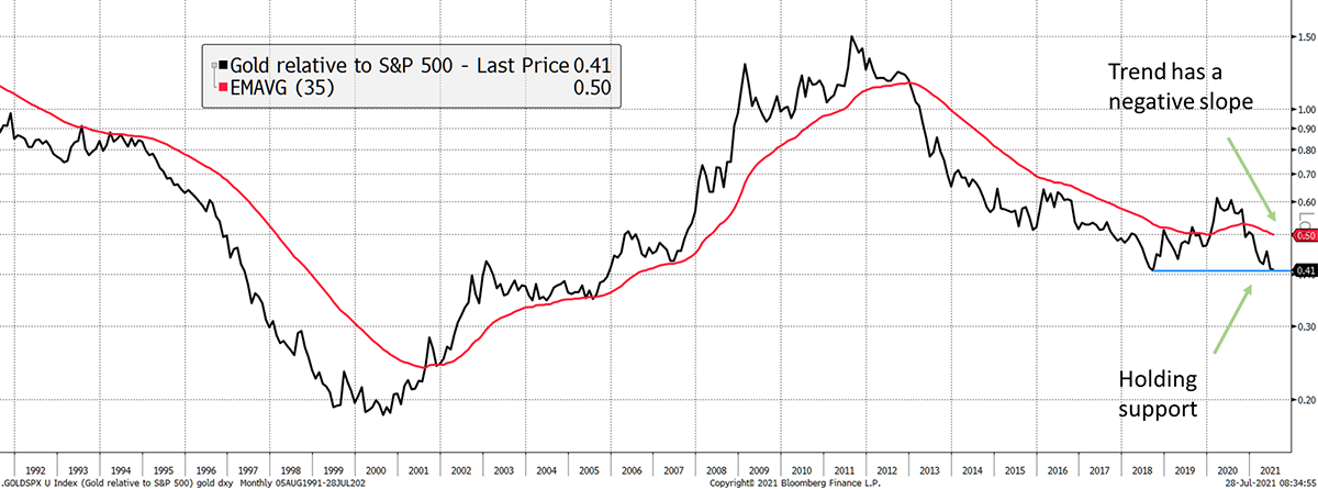 - The gold price relative to the S&P 500, measured by a 35-month exponential moving average. FALSE