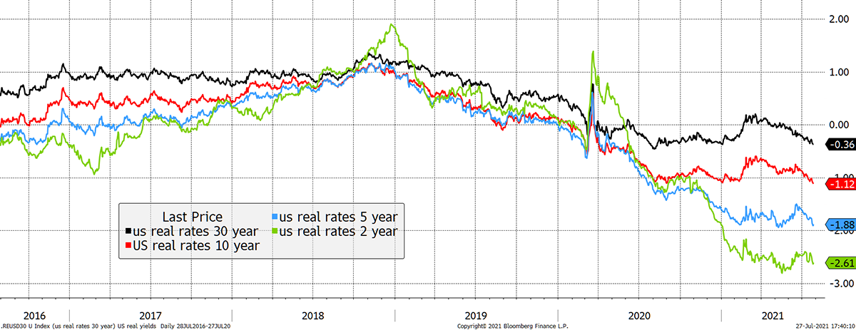 Shorter-term real rates did carry on falling, which incidentally coincided with a Bitcoin surge. I will cover this another time but hold that thought.