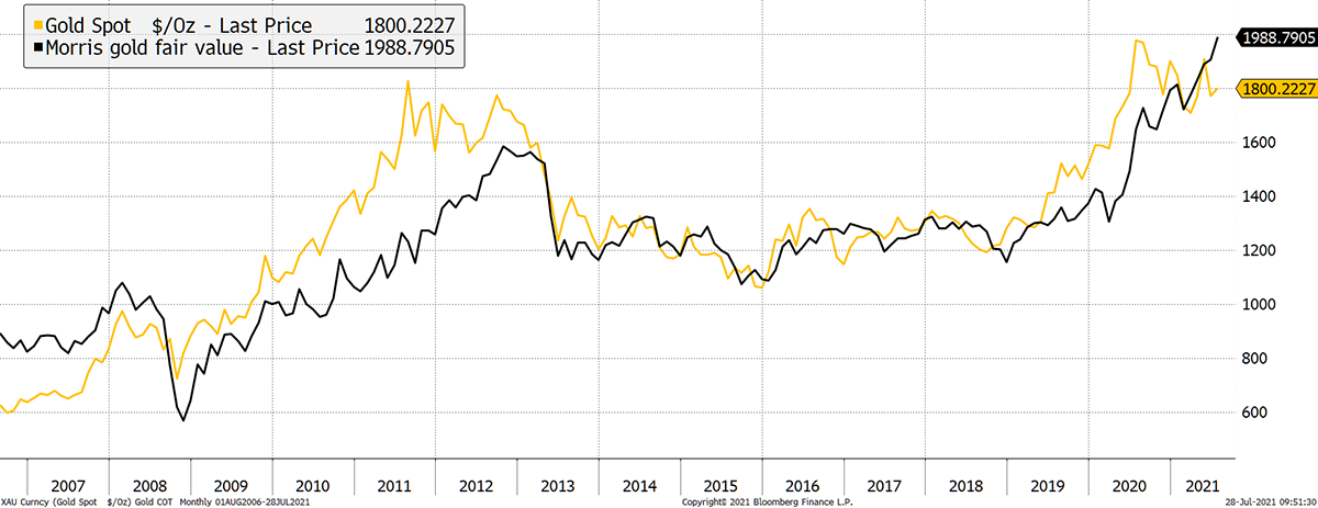 It is well known that gold responds to falling real interest rates (bond yield less inflation). That is, when the cost of borrowing is below the level of inflation, it is generally better to own gold than have cash in the bank.