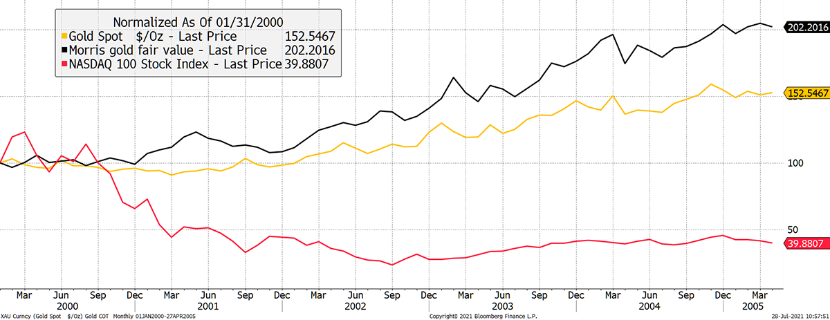 Is this a rerun of the dotcom bubble, where gold reasserts itself as the knight in shining armour after the equity peak? Or is it more like 2012, where gold didn’t respond to the continuing fall in real interest rates before collapsing on their reversal? I vote for the former but will examine the latter.