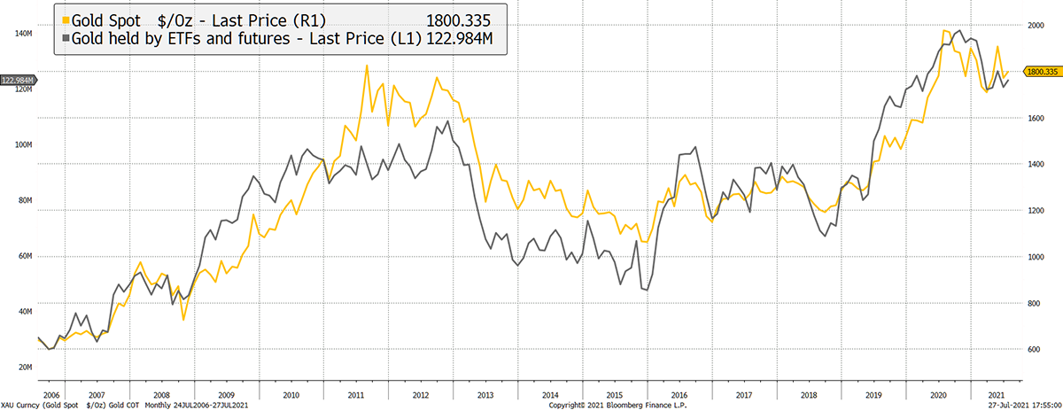 When you look at the gold ETFs and futures combined (longs less short speculative contracts), the link with price never fails to disappoint. Gold has fallen over the past year because investors have sold it. Or, of course, the price slipped first and then they sold it.