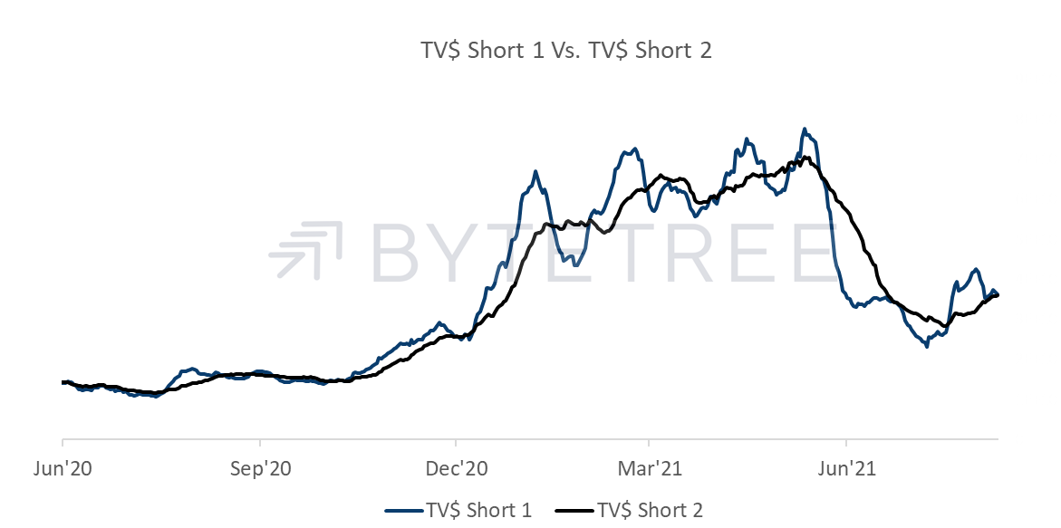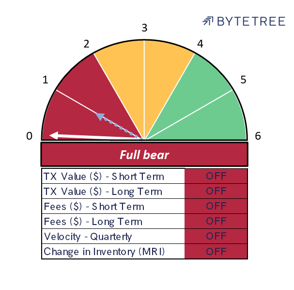 The Network Demand Model closed the week on 0/6, down from 1/6. The short-term transaction value metric has turned off, which is surprising given that this is a price-driven indicator, and we have seen such a substantial price bounce. It suggests that “buying and holding” is very robust at this point.