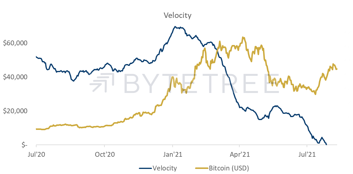 Velocity, which measures the frequency with which coins circulate through the ecosystem, remains low, which is negative from a network effect perspective, but also suggests that the ecosystem is far from euphoric.