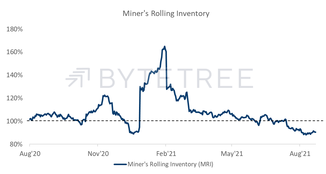 Miners themselves continue to stockpile bitcoin. MRI shows the percentage of newly minted coins that are “spent” into the market for the first time.
