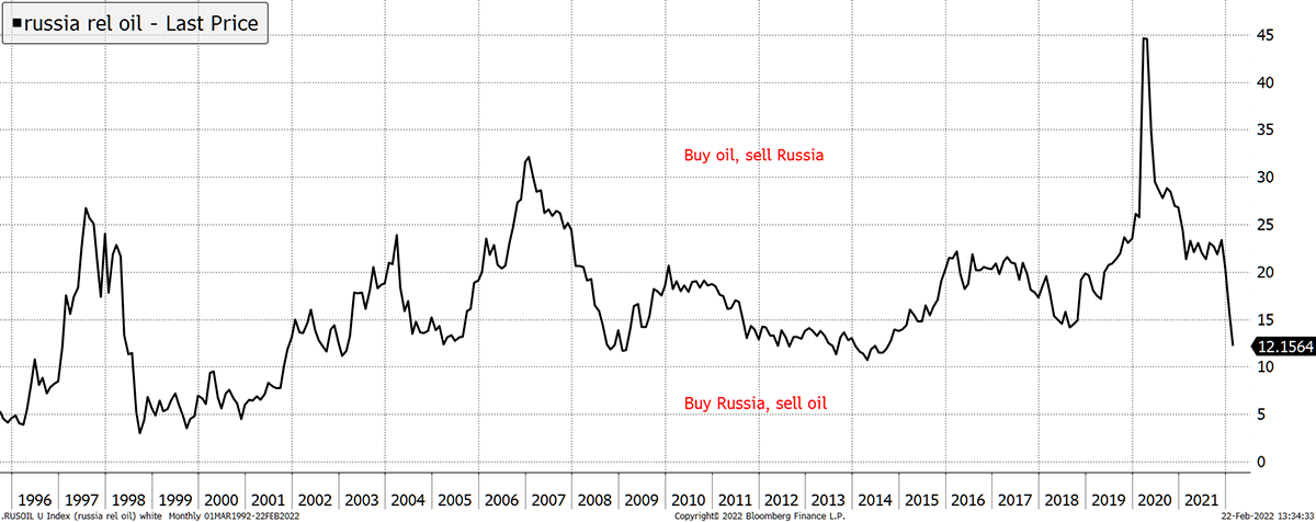 As a bonus, I’ll show one of my favourite relationships – the link between Russian stocks and the oil price. The two series are highly correlated, in a mean reverting relationship. It is rare to see oil so strong while Russian stocks are so weak.