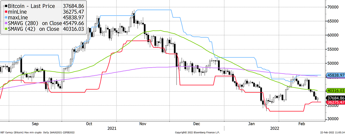 Source: Bloomberg. Bitcoin with 20-day max and min lines, 42-day and 280-day moving averages past six months.