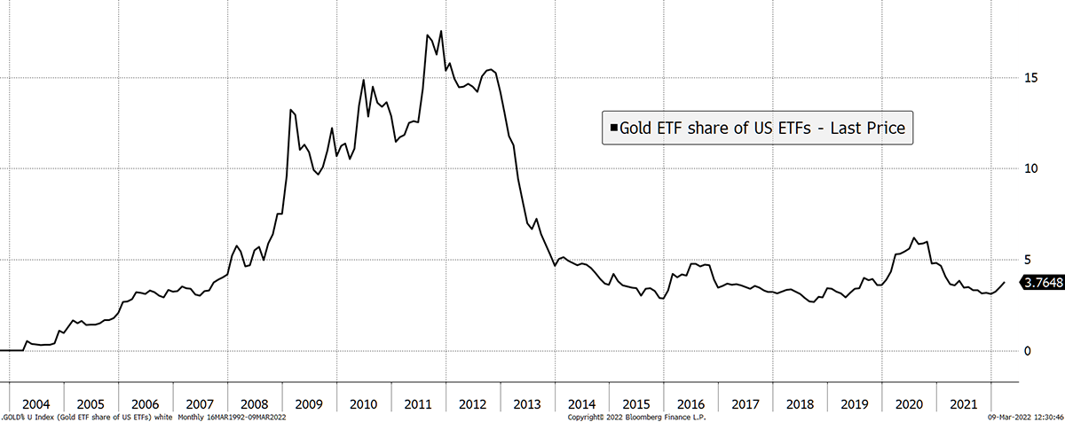 One reason is that the institutional investors are still heavily underweight gold and are behind the curve. Today, the US ETF industry controls circa $5.5 trillion of assets. At the last major gold peak in 2011, the total ETF assets were $0.83 trillion and gold enjoyed a 17.6% share of that market. Today, gold represents a measly 3.7% of total assets.