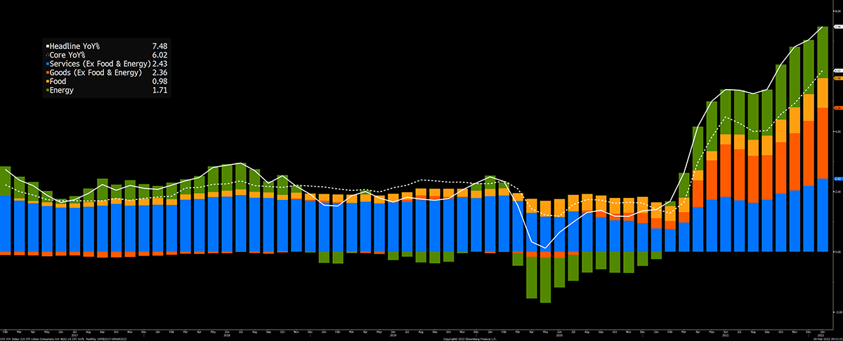 This fabulous chart from Bloomberg breaks US CPI down by contribution from services, goods, food, and energy. Services (blue) were stable but have risen to a five-year high. Goods (orange) have switched from being a deflationary contributor pre-2020 to a major source of inflation. Food (yellow) is just waking up, and given the surge in wheat, expect much more to come. Finally, there’s energy (green, ironically), which has reawakened from negative prices in 2020. None of these pressures will fade away soon.