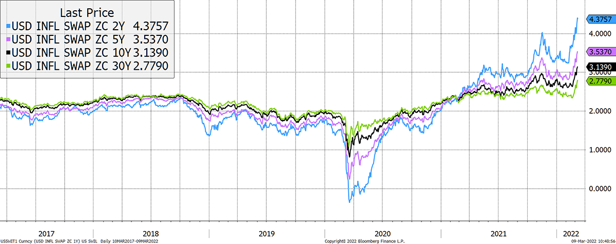 Inflation expectations have surged. The piece that investors should pay attention to is the change in the long-term expectations that impact asset prices. The 30-year reading has made a ten year high.