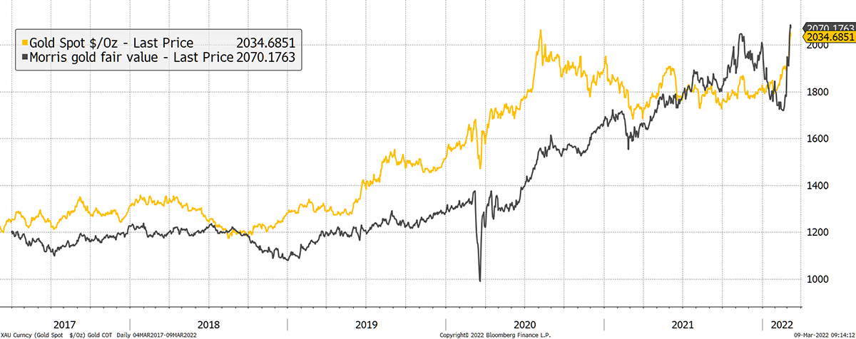 It is widely accepted that real rates drive gold, and that it is a long term store of value. My gold fair value model takes these ideas into account, and the objective is to see where we are. Currently, gold is trading in line with fair value.