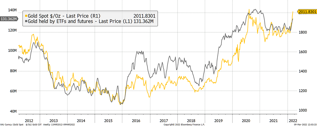 Investors are once again allocating to gold, and we are some way off extremes that we will inevitably see. The recent price move has moved in sync with inflows which is further evidence that the price response is rational. The flows shown combine the ETFs with the futures market, which is a reasonable measure of institutional involvement.