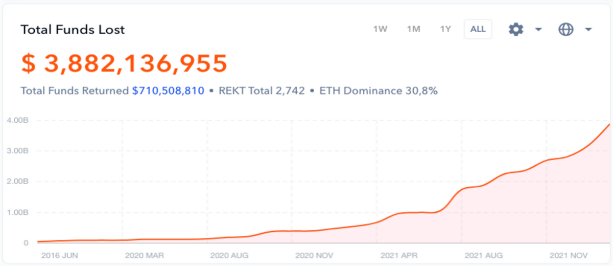 According to data from DEFIYIELD, DeFi scams and hacks are reported to be over $3.8bn in total, where Ethereum contributes to over 30%. On 28th March 2022, DeFi saw its biggest hack to date, where $615.5m was stolen from Ronin, a blockchain project linked to the popular online game Axie Infinity.