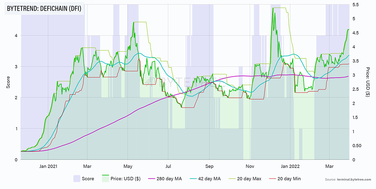 DFI is the native token of the DeFiChain blockchain and was first listed on LaToken in May 2020. After seeing substantial growth (45%) in the past month, DFI is priced at around $4.60, with a $2.3bn market cap. DFI has also been holding a 5/5 score on ByteTrend for quite some time, demonstrating a strong and relative price trend.