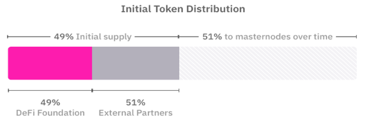 DeFiChain did not conduct any sales, nor did they participate in an ICO or IEO. Out of the roughly 1.2 billion DFI coins, 49% were issued to the DeFiChain Foundation at the start. Of the 49% initially issued $DFI coins, 49% will be kept by the DeFiChain Foundation. The rest were distributed to accredited investors, large funds and institutions, collectively known as external partners below, to fund the initial development of DeFiChain.
