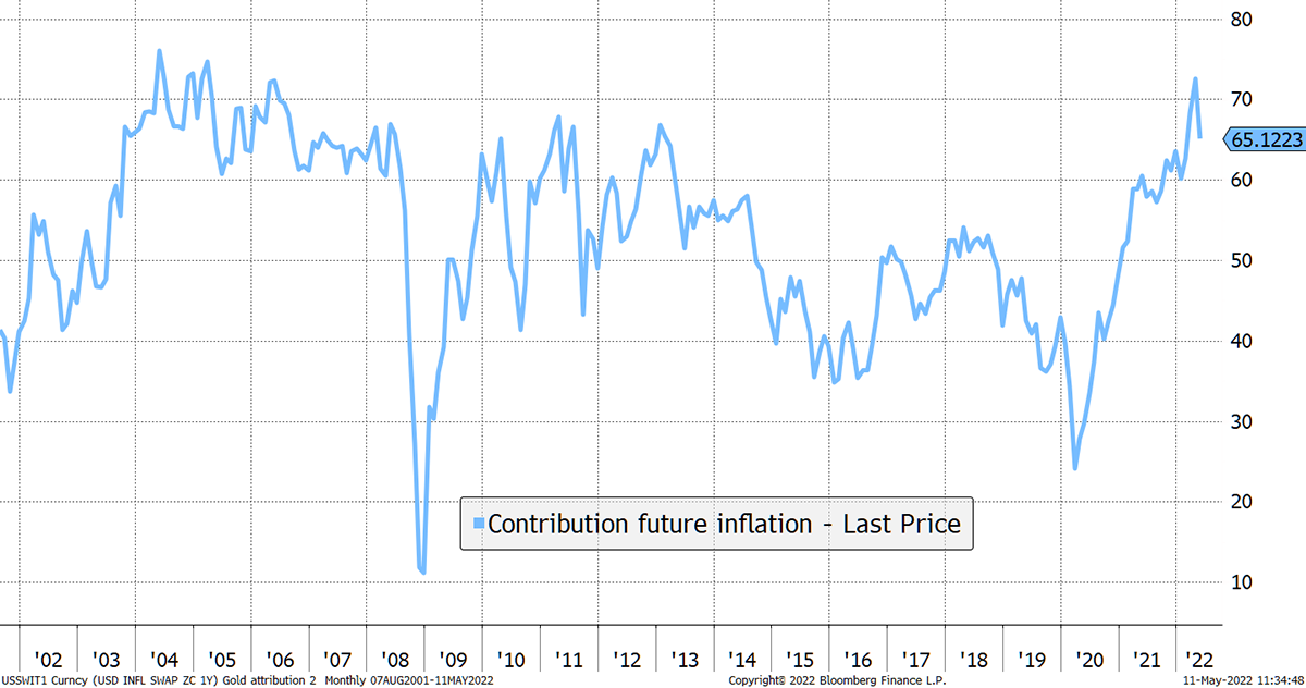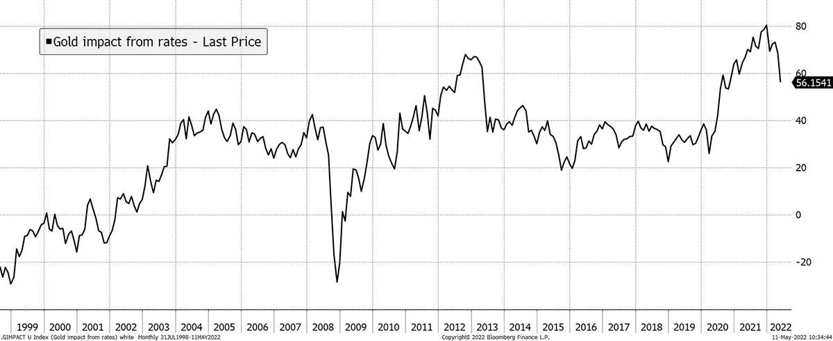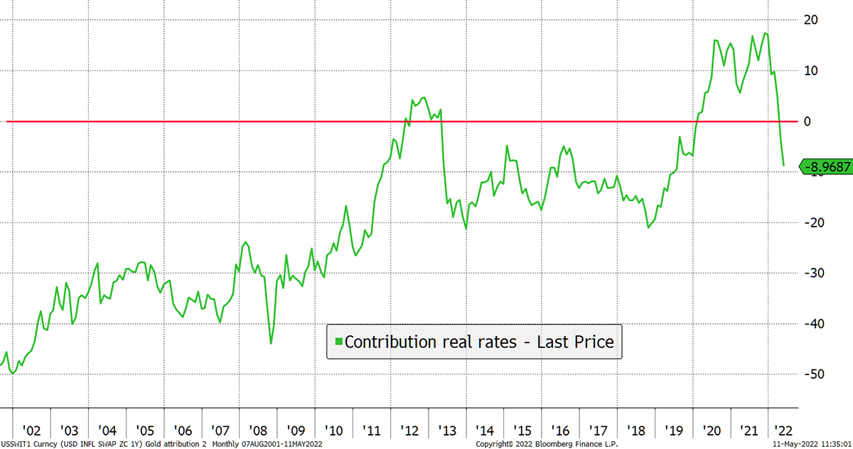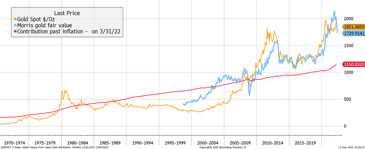 These two different drivers sometimes work in harmony but can work against one another. Inflation was driving the fair value of gold higher in 2020 and 2021, but real rates had already stalled, and have applied a downward pressure this year.