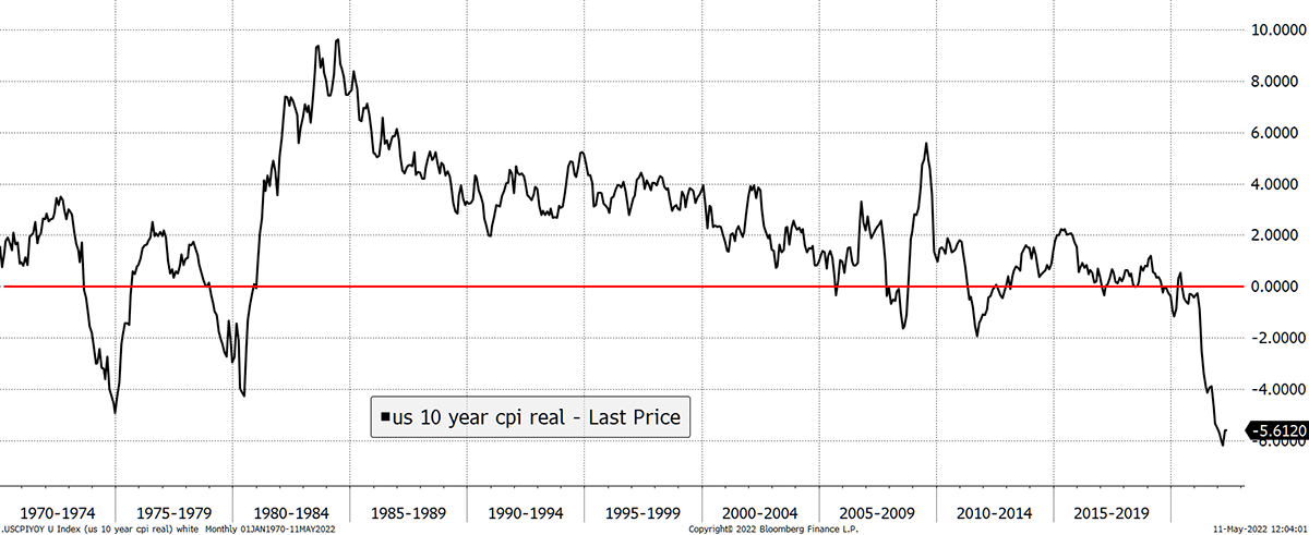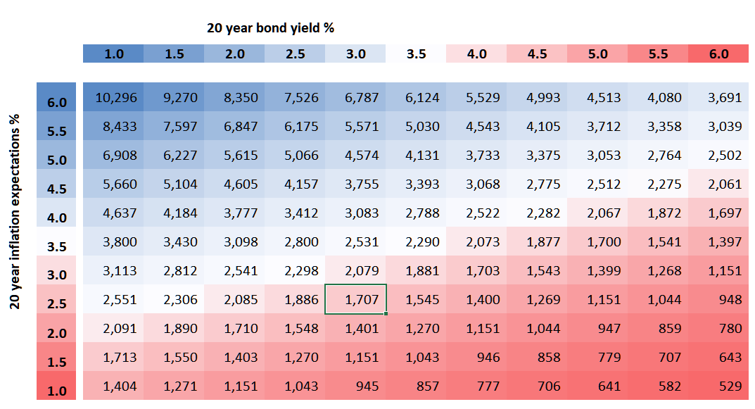 We do not know what inflation expectations were before 1998, but we can guess what real yields might have looked like using CPI. After a painful period in the mid-1980s, they must have averaged around 4% in the late 1980s and 1990s. That implies the impact from high real yields would have held the price back by around 50% during that period, which oversaw falling inflation.