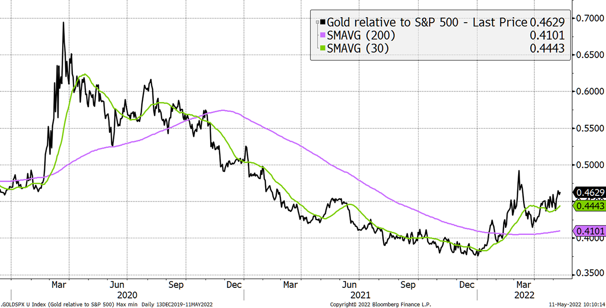 - The gold price relative to the S&P 500 is rising, measured by a 35-month exponential. TRUE