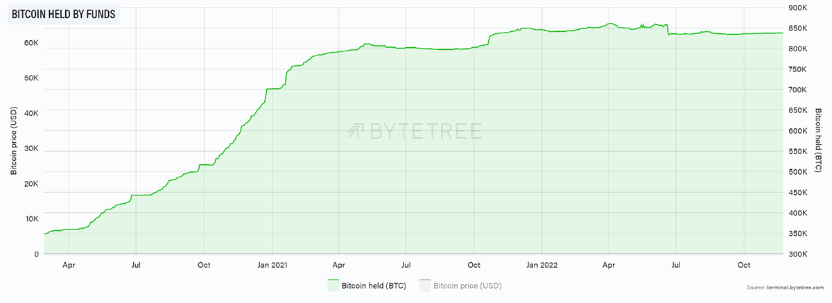 According to ByteTree data, 838,116 BTC are held by funds and ETFs, which is 4.4% of the total bitcoins mined to date. That had been growing into mid-2021 but has subsequently slowed.