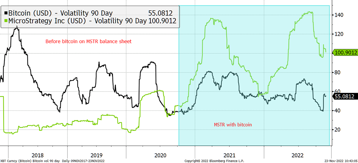 The $2.2 billion of debt is what makes MSTR more volatile than bitcoin itself. That is because when the price of bitcoin falls, the debt remains flat while the value of the assets falls. Hence MSTR volatility peaks have coincided with bitcoin price drops.