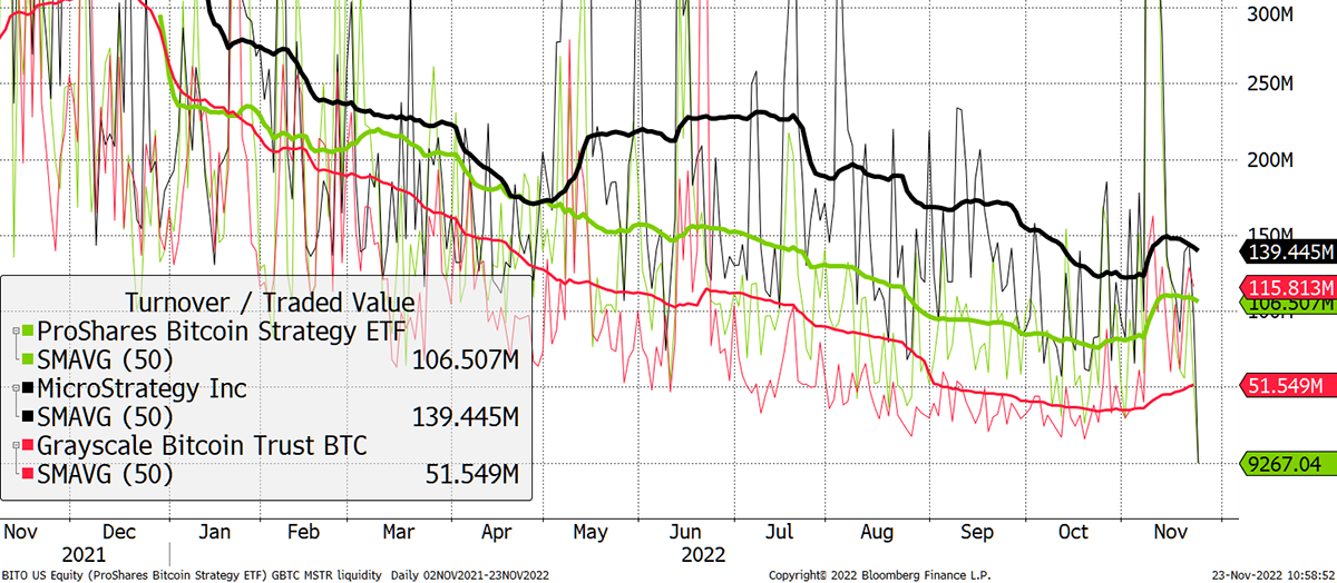 The largest fund, GBTC, is the least liquid, trading $51m per day. BITO comes next, trading $106m per day. Finally, the most liquid vehicle is MSTR, which trades $139m per day.