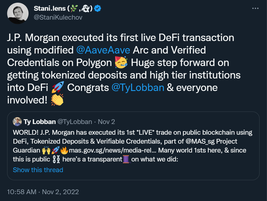 The chart above shows the price action for AAVE since the start of the year. As we can see, it has been quite mediocre, showing moments of strength that quickly dissipated. The most recent sign of bullish price movement was in early November 2022 when Stani Kulechov’s tweet confirmed that JP Morgan had executed its first DeFi transaction using a modified version of Aave and verified credentials on Polygon.