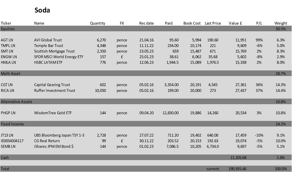 Soda - a long-term, low turnover portfolio investing in funds, exchange-traded funds (ETFs) and investment trusts. The Soda portfolio is down 4.6% this year and is up 90.9% since inception in January 2016.