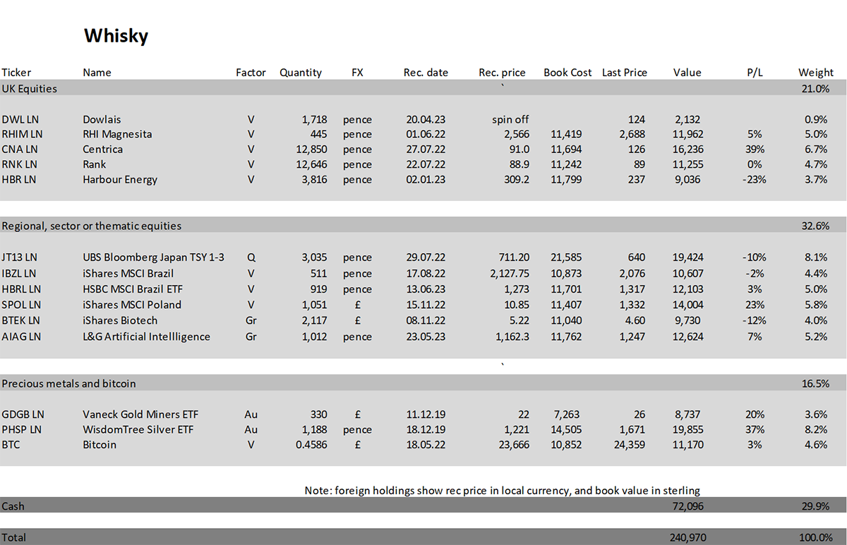 Whisky - a tactical, actively traded portfolio investing in stocks in the FTSE 350 Index, investment trusts, global ETFs and bitcoin. The Whisky portfolio is up by 7.9% this year and up 141.0% since inception in January 2016.