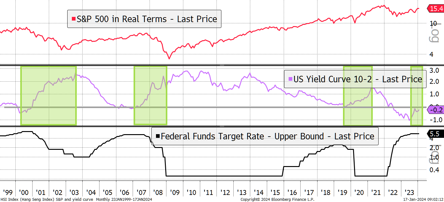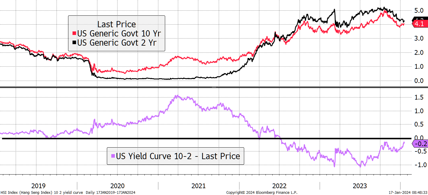 In 2021, the 10-year bond paid 1.7%, and the 2-year paid 0.2%, a 1.5% gap. That coincided with a surging stockmarket on the back of vast stimulus packages. In 2022, the 2-year yield overtook the 10-year, thus “inverting” the yield curve. It has remained inverted for a long time, yet we still haven’t seen the widely forecast recession. In recent months, the curve has been “steepening” or “normalising” as the short-term rates catch down with long-term rates.