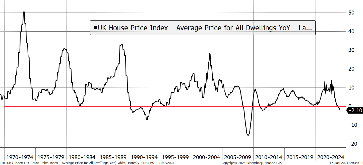 UK house prices were also reported today and are down 2.1% year on year. That’s the fifth consecutive negative month and hardly surprising given where interest rates are. The post-pandemic housing boom is clearly over. Looking back to the 1970s, it’s notable how infrequent falling house prices are.
