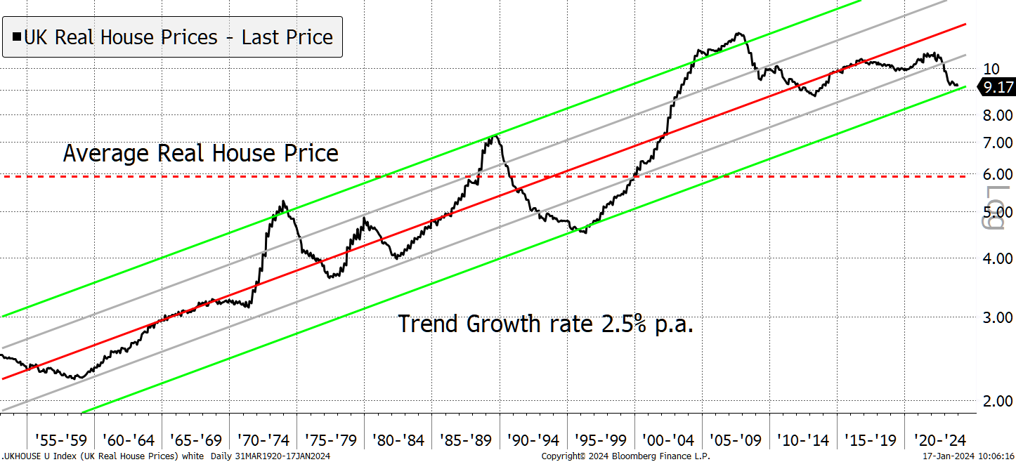 It’s a shame we don’t know more about the history of property prices because we would be better prepared. If UK houses trend at 2.5% real, we are already at the bottom of the range (chart UK Real House Prices above), and it’s a good time to buy. Yet, given how implausible it is for a young person to buy a house these days, I struggle to believe today’s houses are cheap. I am more swayed towards the Herengracht thesis, in which case, UK real house prices could drop by a third just to revert to the mean, just as they did in the 1990s.