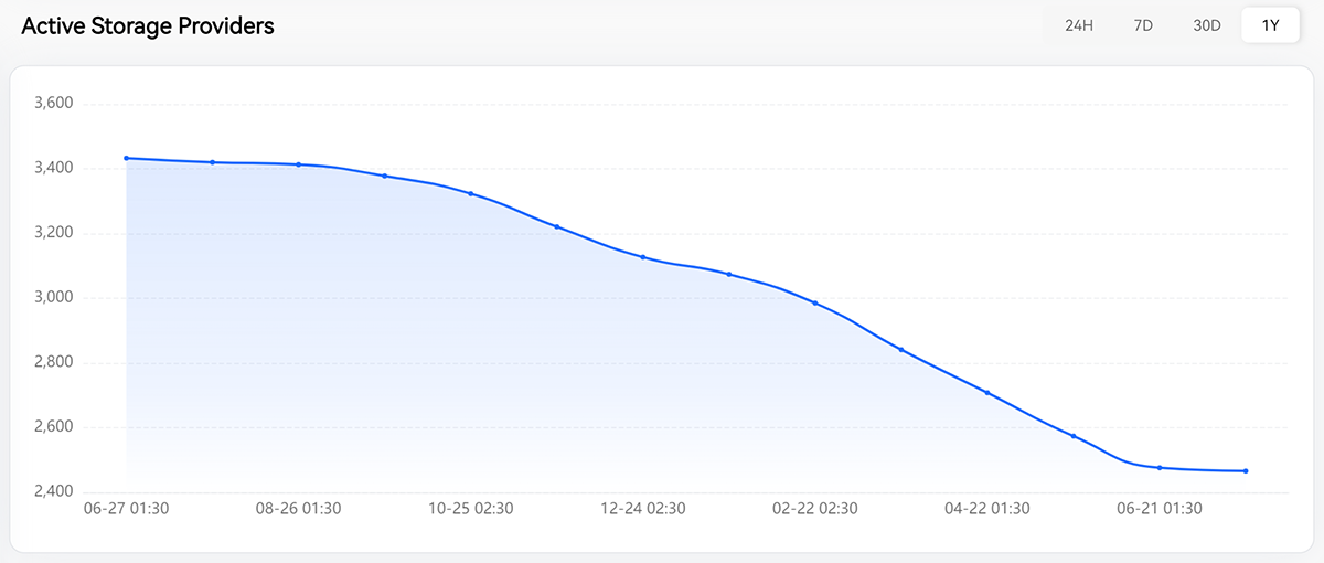 In the Web3 landscape, Filecoin stands as the largest decentralised cloud storage platform with a $2.5bn market cap. Arweave is currently the runner-up with a $1.74bn market cap. Filecoin became successful early on, with its native token FIL peaking at $237 in 2021. However, FIL is presently valued at $4.40, a 98% drop from its all-time high and down 10% since February 2024. As noted earlier, the AR token has contrastingly risen by 240% since February. Although external factors may have had some impact, Filecoin’s prolonged downturn is likely due to declining platform metrics.