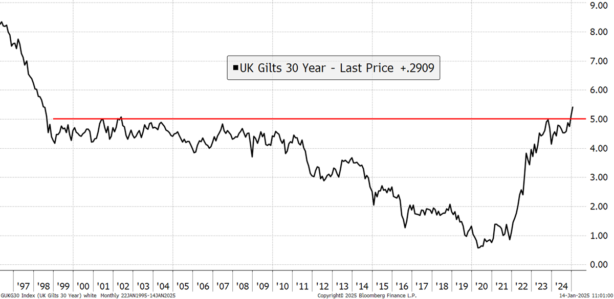 Just a few weeks ago, the expectation had been a shift towards quality, as both rates and inflation had been expected to fall. My take had been the long bond, which is highly sensitive to falls in interest rates. My thesis was that 5% had become a firm line for gilts that was unlikely to be crossed. Had yields fallen to 3%, those gilts would have made sizeable gains of nearly 50%. But once that 5% level was broken, which had held since 1998, something had changed.