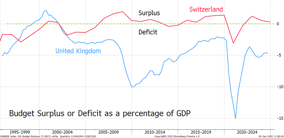 The difference between what the government receives and what it spends is the surplus or the deficit. In 2024, the UK spent more than it received, and so there was a £122 billion deficit. In Switzerland, the government spent less than it received and had a modest budget surplus.