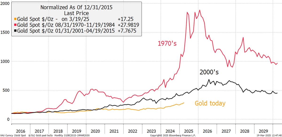 As gold breaks $3,000 for the first time, some investors are getting the jitters. The price has nearly trebled since the low in late 2015, delivering a solid 12% per year since. Trebled sounds like a lot, whereas 12% p.a. doesn’t. The gold move is tame compared to great moves of the past.