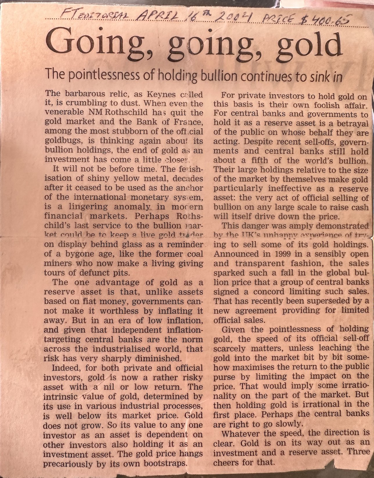 In 2004, the FT wrote an editorial about gold. Negative, of course. I liked the line, “Gold is on its way out as an investment and a reserve asset. Thank goodness for that.” The price was $400, and today, over $3,000. H/T @maneco1964