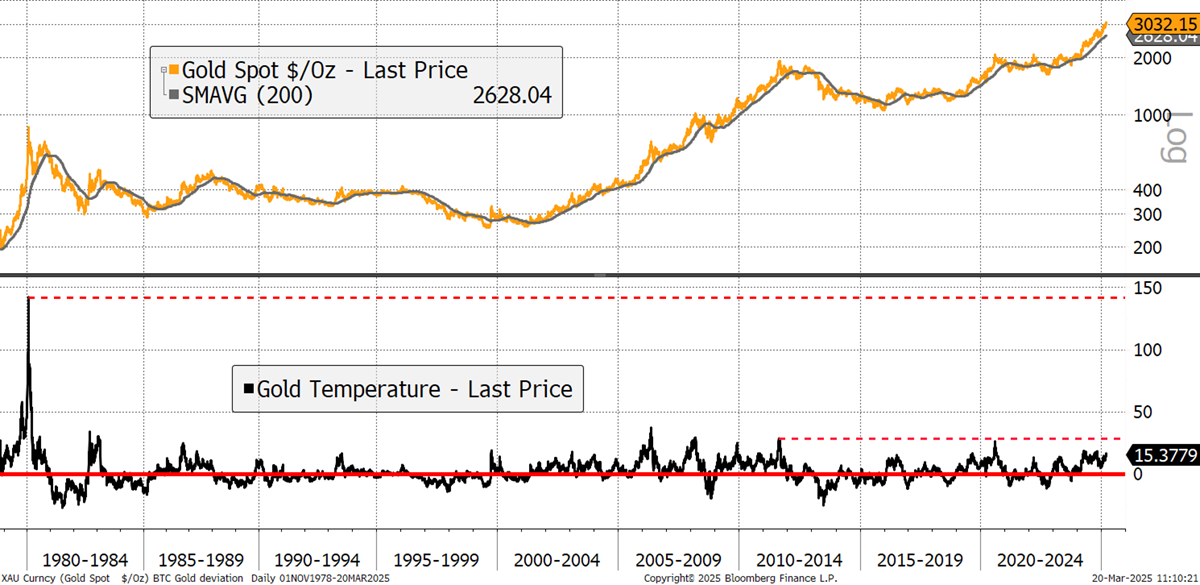 I want to show a few charts to demonstrate how the current gold rally is underpinned and a long way from danger territory. The first and simplest point is that the price of gold is not particularly overbought relative to its trend. I measure that with a deviation from the 200-day moving average and the current reading of 15%. That is, the price of gold is $3,030 and the 200-day moving average is at $2,624, so gold is 15% above it. At the 2011 peak, that was 28%, and at the 1980 peak, 140%. Gold is not overbought on this basis. It is displaying the signs of a healthy bull market.