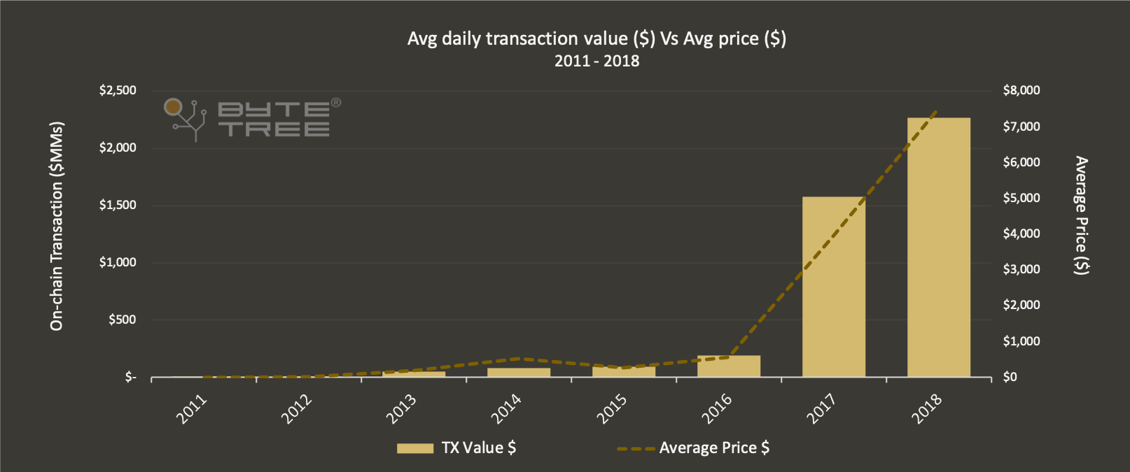 The total volume of transaction activity taking place over the Bitcoin Network has grown from an average of $600k in 2011 to over $2.2Bn per day in 2018. The chart below outlines the increasing value transferred over the network since 2011.