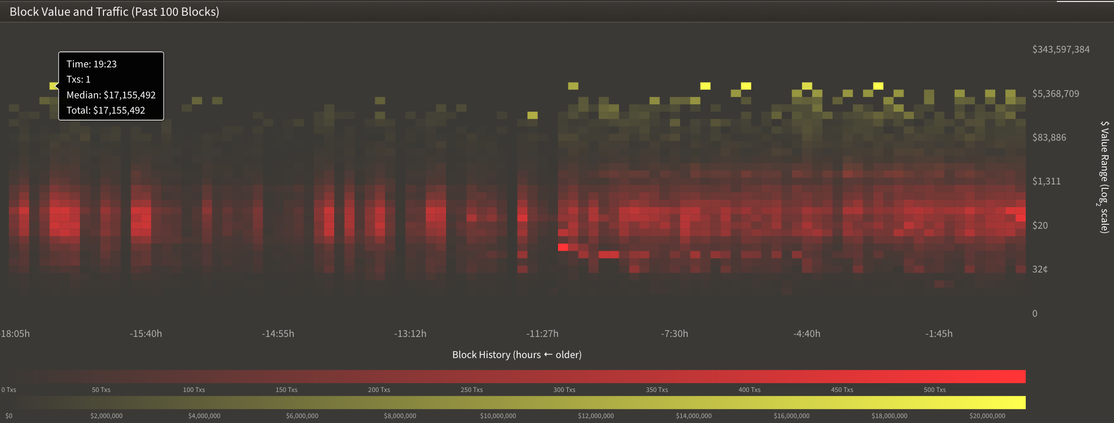 On the heat map above you are looking at the last 100 blocks of activity (x-axis) versus the value ranges in dollars (y-axis). Each column represents one block and each block has around 3k transactions in it, meaning each column contains information on around 3k transactions. The rows represent different “value bins” and the value bins double as you move up the axis. As an example, we have value bins for $1-$2, $2-$4, $4-$8 and so on. The colour scale is used to visually represent the volume of transactions within each value bin. The redder a square is, the more transactions in it. The yellower a block is, the higher the dollar value of that square. Bright red and bright yellow together (bright brown) would signify a high density of high value transactions.