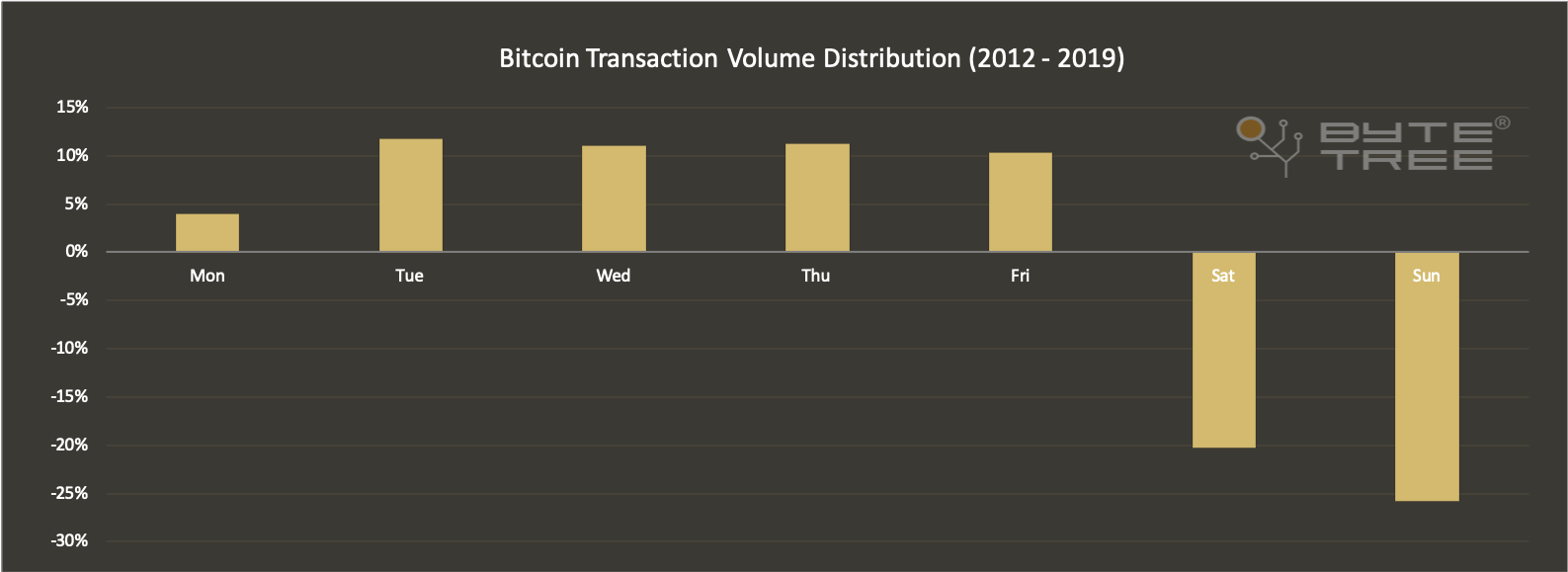 The value exchanged over the bitcoin network has become so significant that for all intents and purposes it is now a fully-fledged digital economy. As example of how Bitcoin behaves like any other real-world economy is the way that economic output (AKA gross domestic product or GDP) drops at weekends, despite the networks availability to support settlements 365 days of the year. This weekday bias can be viewed on the chart below;