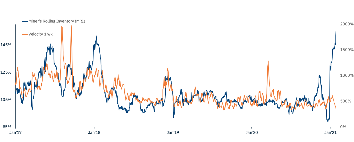 We normally point to Miners’ Rolling Inventory (MRI) as something that reflects a healthy market, as they sell into a strong bid, and hold back and accumulate when the market is soft. However, at significant market peaks, this has reversed, and the miners are dumping Bitcoin like it’s January 2018.