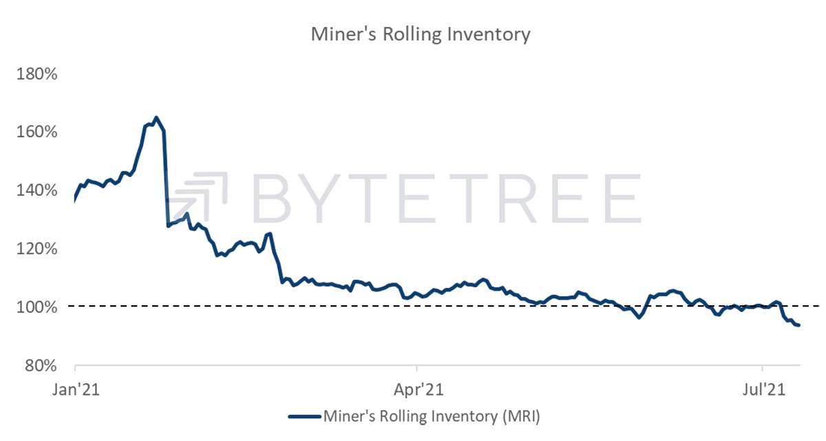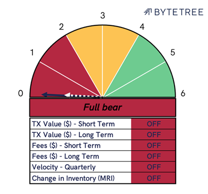 With the bitcoin price ranging between US$30-40,000 we are on the lookout for signs that the short-term indicators are starting to pick up. As of yet, there is scant evidence. The Miner’s Rolling Inventory metric is “OFF” and continues to decline, which means “unspent” inventory rises. This is a weak set-up for sustained positive price performance, unless there is a meaningful increase in demand.