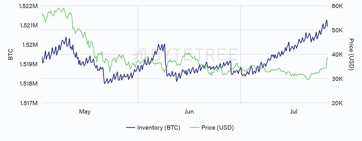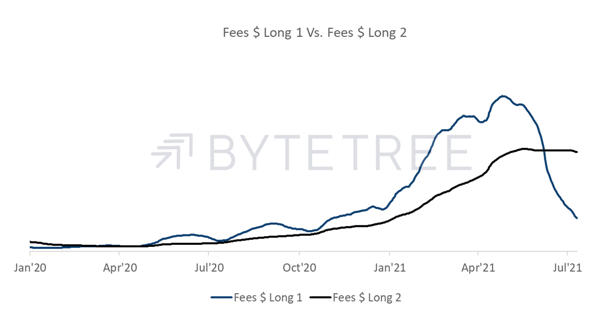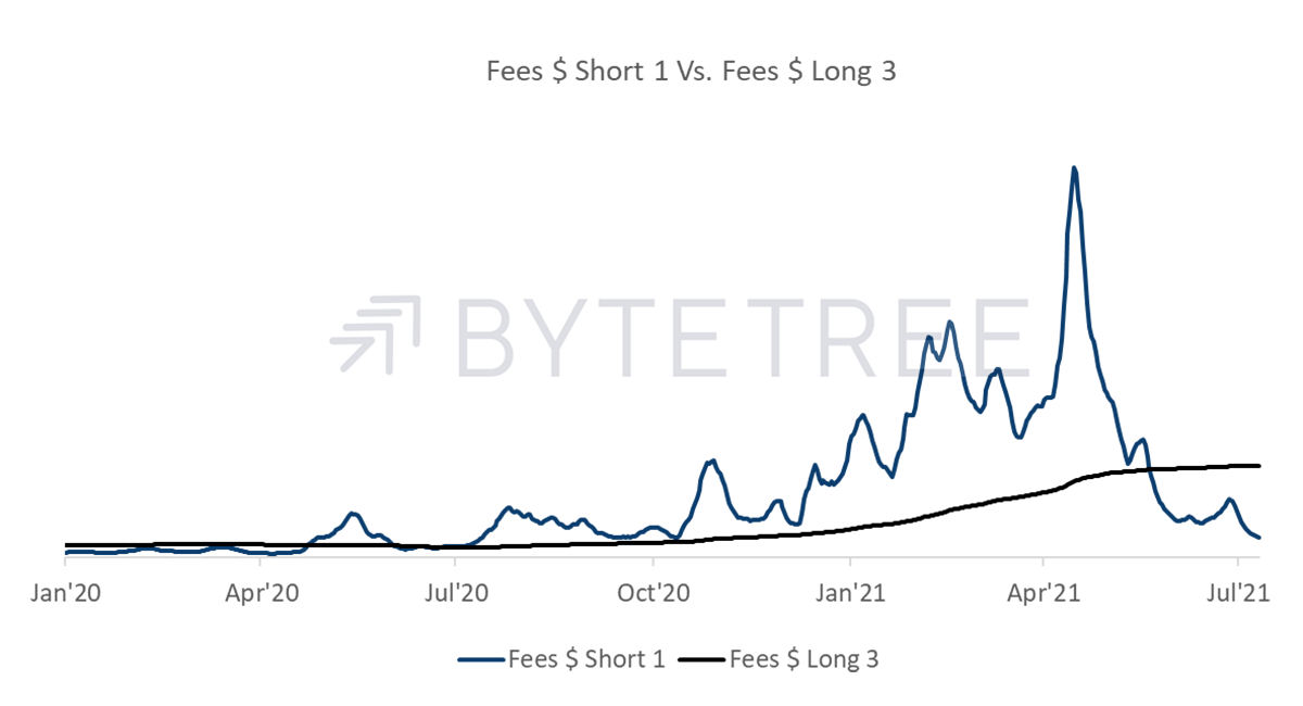 The Network Demand Model remains OFF this week, with the score remaining at 0/6. While the price of bitcoin has bounced sharply from the week’s lows of US$29,790.20 to close at US$35,226.95 on 25/7/21, the price action hasn’t so far been corroborated by a pick-up in network activity. This suggests shorter-term technical factors are at play rather than a change in underlying trend.