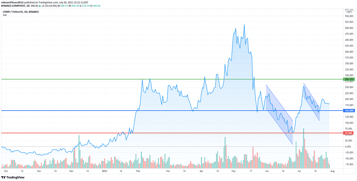 COMP performed well at the beginning of 2021. Although, since its peak in May, we have seen the mid-range support level broken (blue line) and then retraced to this month, indicating a shaky market. However, events like those can create clear trading opportunities. Late June provided investors with an opportunity while a major support line (red line) was tested.