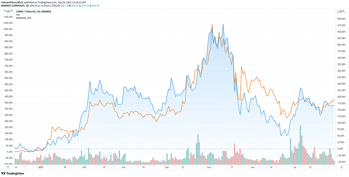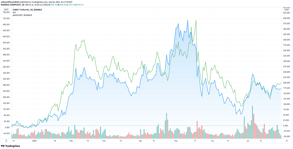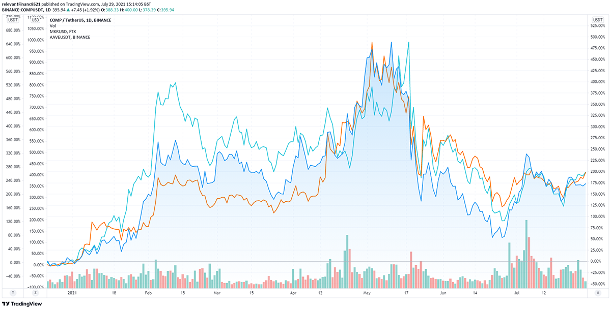 I’ve chosen Maker and Aave as the main comparisons since they, with COMP, collectively hold $27.32b in TVL, while the total TVL for the entire lending sector is $30b (according to DeFiPulse - they certainly are the competitors. Although Token Takeaway is fixed on the leaders in the space, I recognise there are other tokens such as Alpha, Liquity and C.R.E.A.M Finance. Nevertheless, they are not the leaders and tend to experience protocol-level exploits that investors must avoid at all costs.