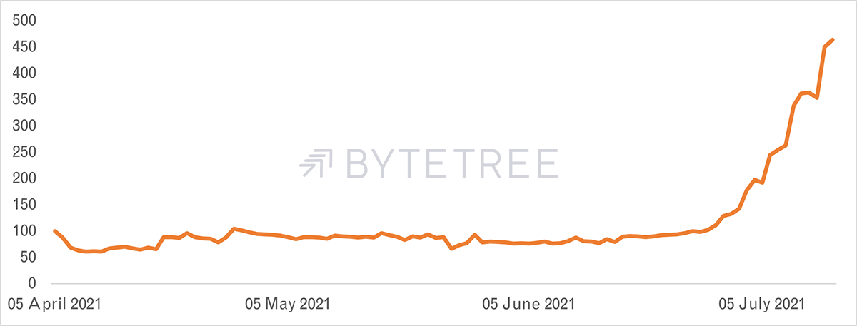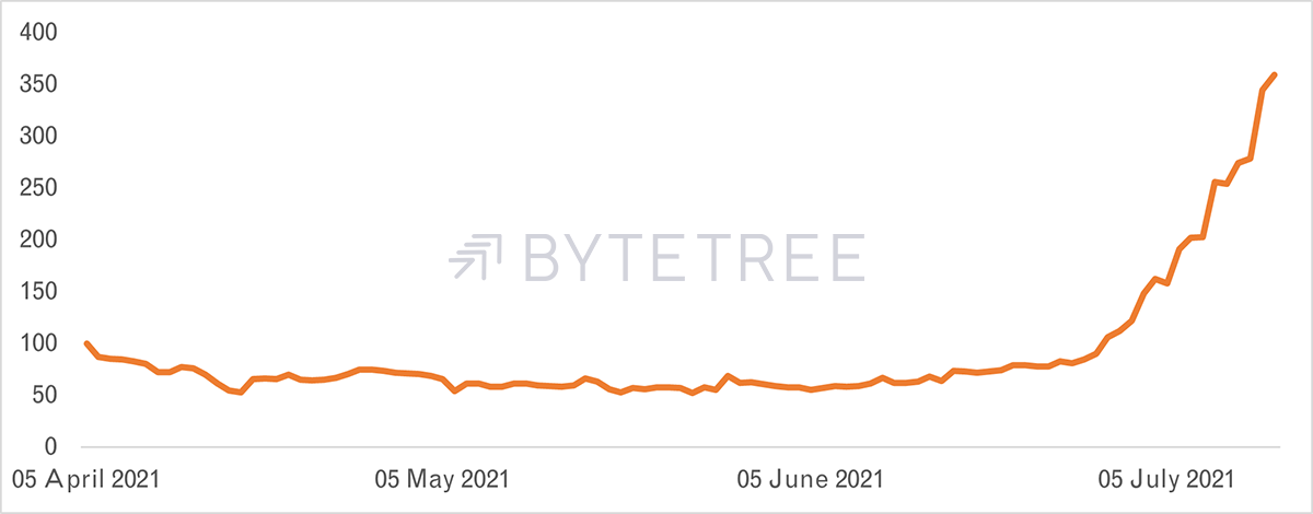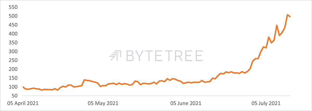 Notably, NBATopShots resides on the FLOW blockchain. According to dAppRadar, the FLOW blockchain has the highest historic volume ($631.67m) amongst NFT platforms. However, over the last 30 days, Axie Infinity volume ($394m) has exploded in comparison, which conveys that Axie will most likely be in the lead in a matter of months. This is highlighted well in the relative chart above, which shows the token price performance relative to each other.