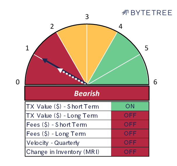 The Network Demand Model remains at 1/6, with the sole positive signal being short-term transactions. Remarkably, even this metric has started to weaken again and it’s possible we could be back to 0/6 shortly.