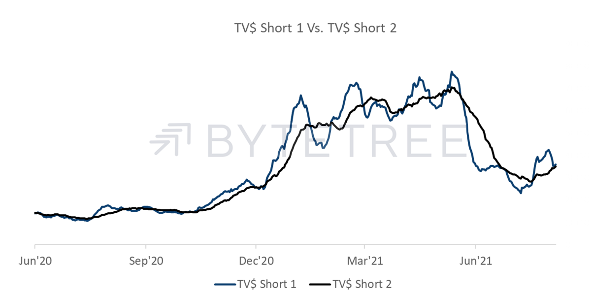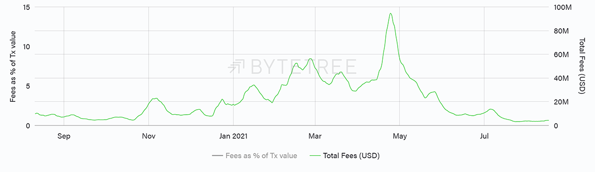 The better news is that Fees have perked up, probably on an account of the recent upward difficulty adjustment, whereby more energy - and hence cost - is now required to power the network. But it’s a small increase in a historical context (see charts over 1 week and 1 year below). As long as transaction numbers remain soft, we’ll probably see muted pressure for fees to go much higher, particularly as miners continue to come back online post the China crackdown.