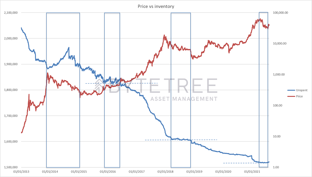 Mining has been tremendously profitable recently, which makes it very tempting for miners to build bitcoin inventory. At what point, though, would they sell? As with so much in bitcoin, the answer is likely to be found in its pro-cyclicality (which is why it is so volatile). As long as the price drifts higher, and mining costs remain low, there is no compulsion to take profit. But if we continue to see upward adjustments in difficulty (and costs), and if the price starts to lose upward momentum, the pressure to cash in will increase. This becomes self-reinforcing, and the avalanche starts to fall. It is striking that if we look back in history, it is rare that the bitcoin price has remained in a bull market until unspent inventory has moved to new lows (see chart below).